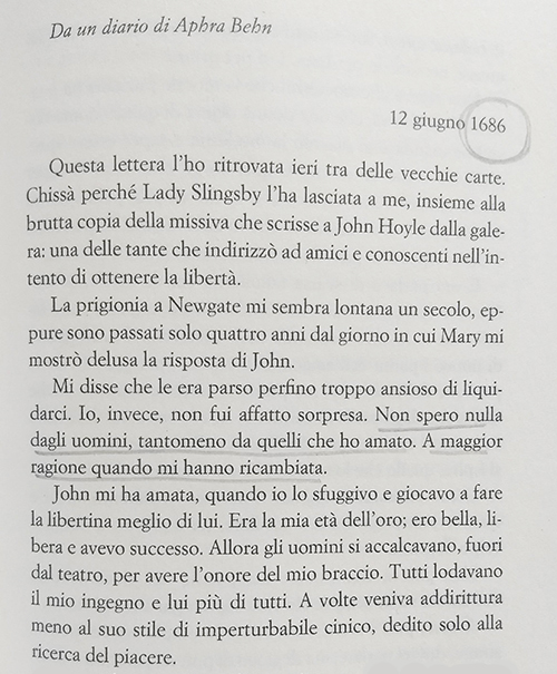 Ciò che più mi affascina nella lettura è la contemporaneità di una autrice del XVII secolo, il suo acume e la determinazione, oltre che un incredibile coraggio. La sua audacia non fu solo nelle parole ma anche nell’agire, posta dinnanzi a scelte difficili -una donna nella seconda metà del 1600- non si perse d’animo e fece tutto ciò che le permise di proteggere la propria libertà. Non priva dell’ironia e dell’umorismo inglese, Aphra Behn visse con ardore e passione anche le più tristi vicissitudini della sua breve vita.